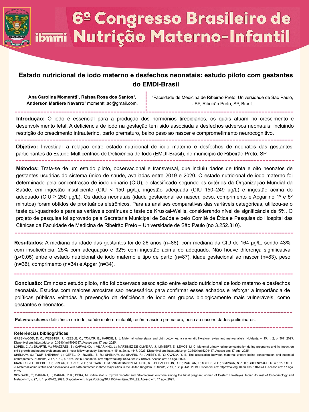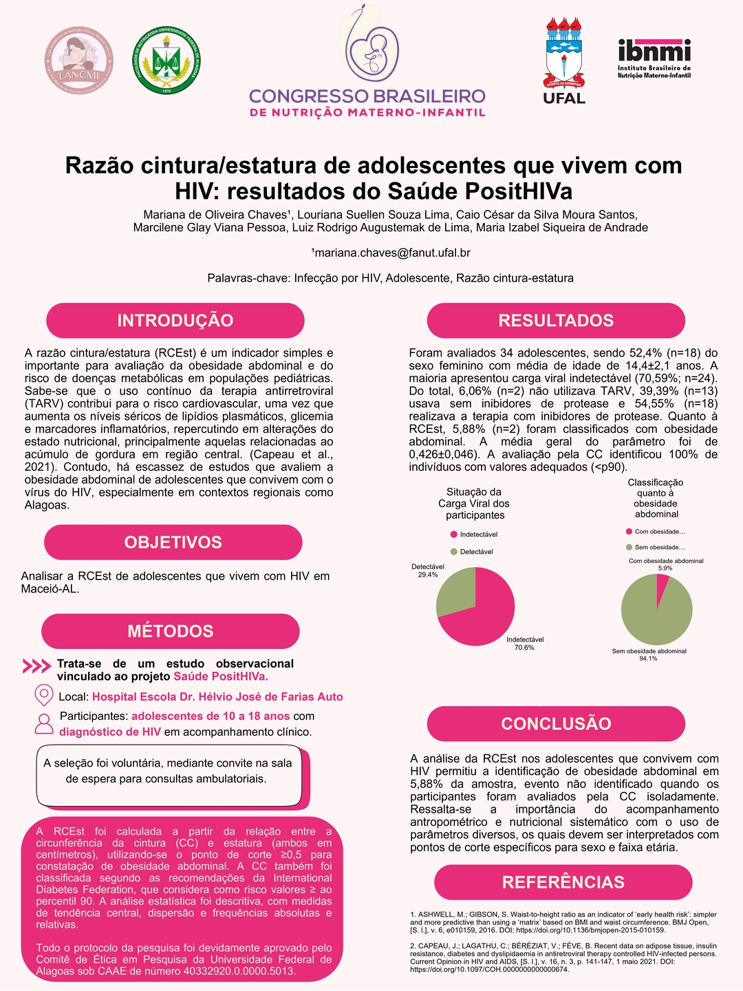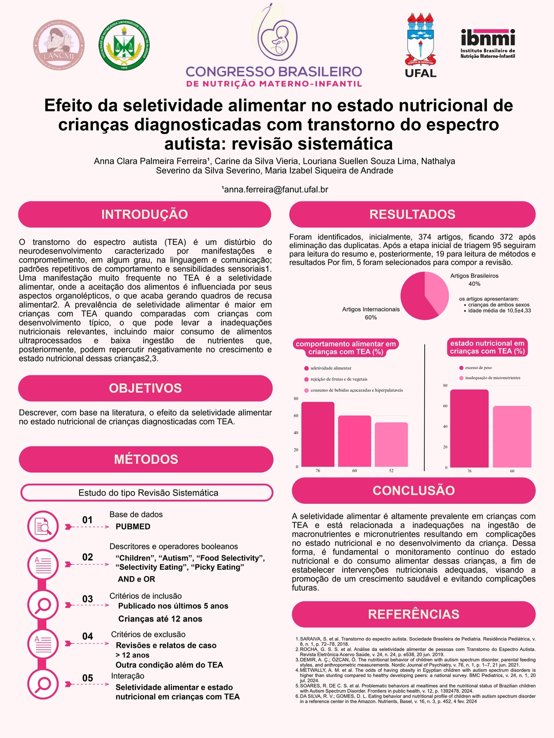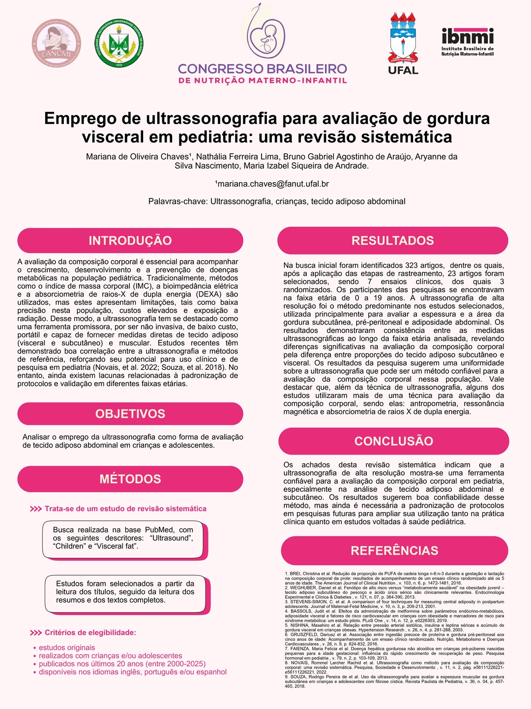 Todos os pôsteres apresentados e aprovados compõem os Anais do 6º Congresso Brasileiro de Nutrição Materno-Infantil, reforçando a relevância da pesquisa e o papel transformador dos profissionais que constroem conhecimento científico na área.
