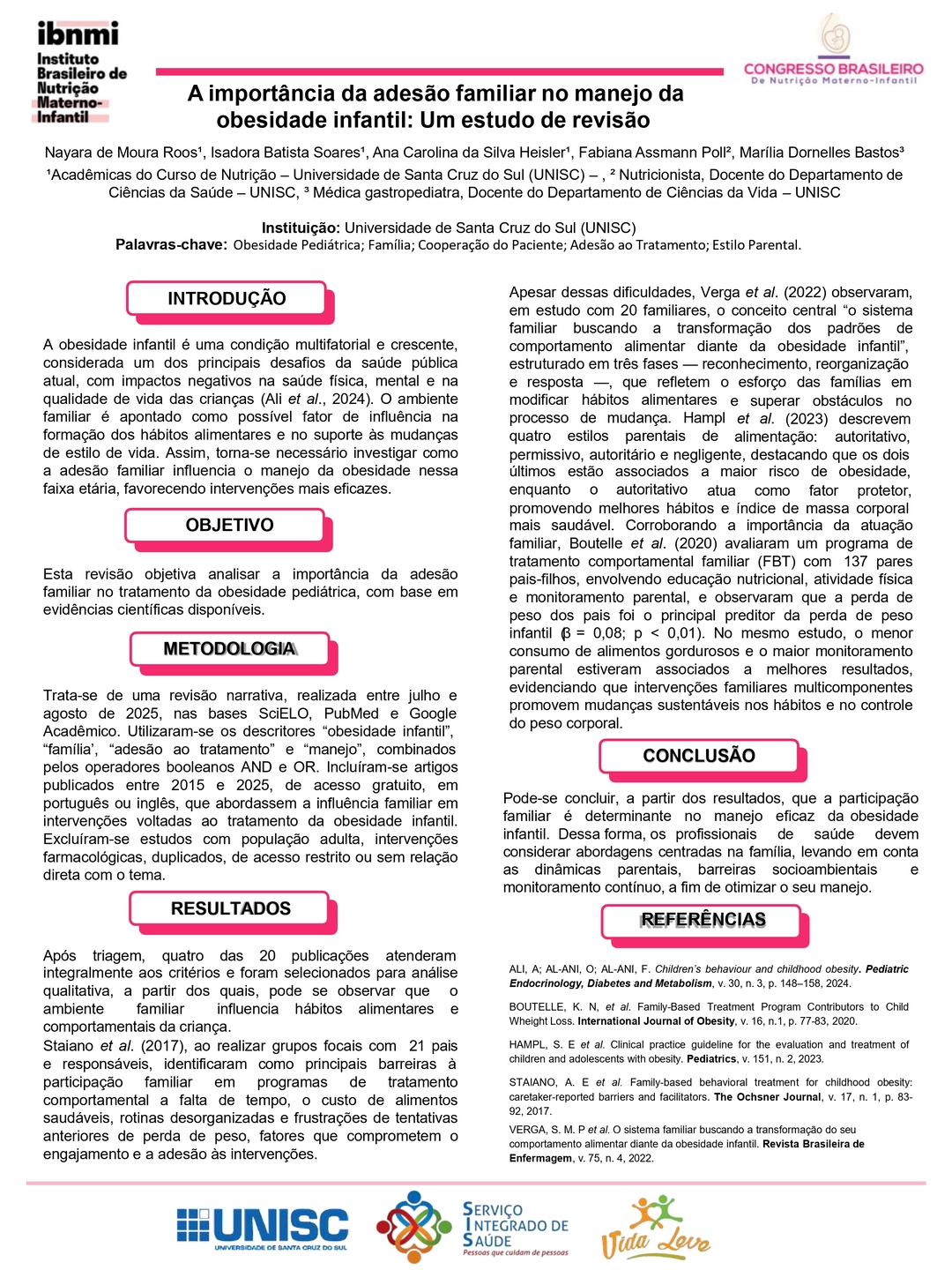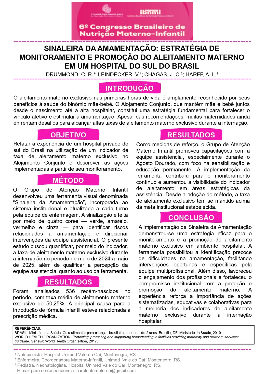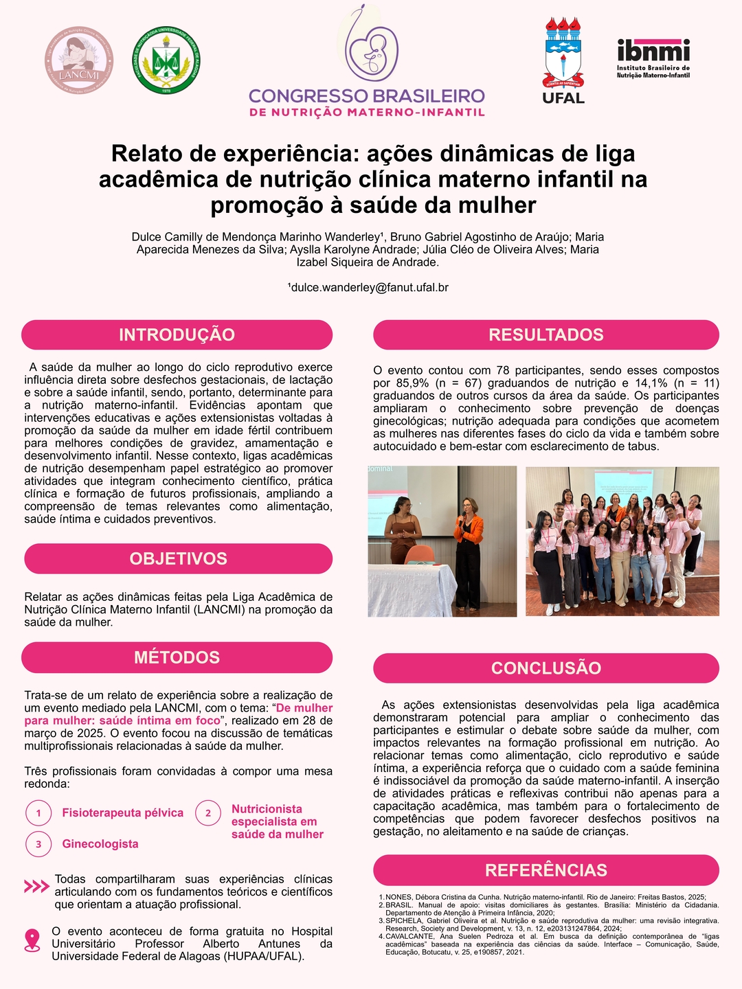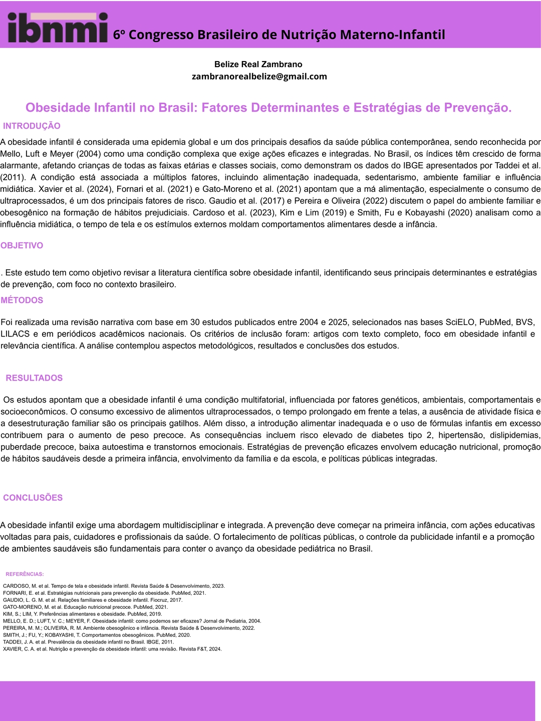 Todos os pôsteres apresentados e aprovados compõem os Anais do 6º Congresso Brasileiro de Nutrição Materno-Infantil, reforçando a relevância da pesquisa e o papel transformador dos profissionais que constroem conhecimento científico na área.