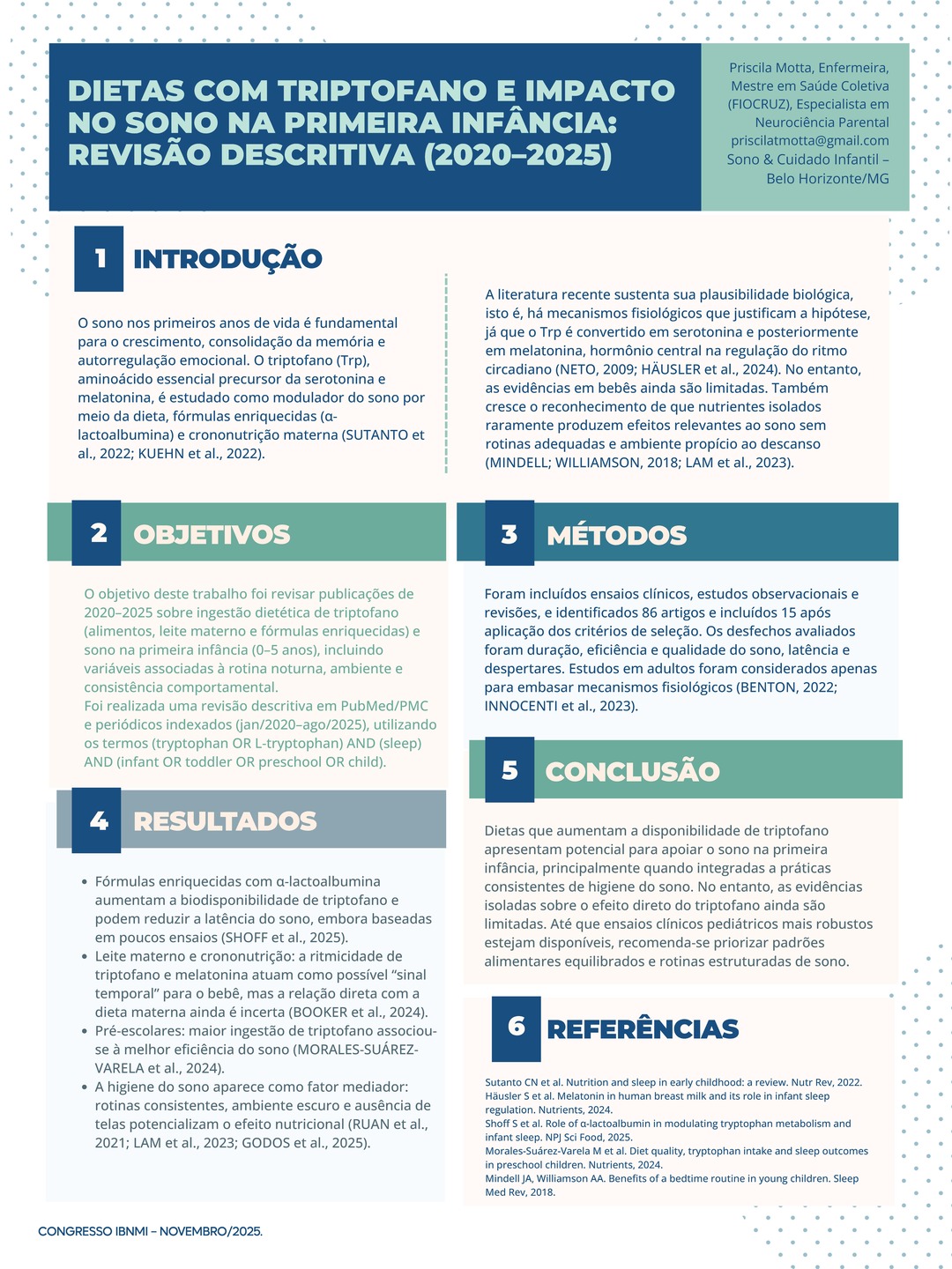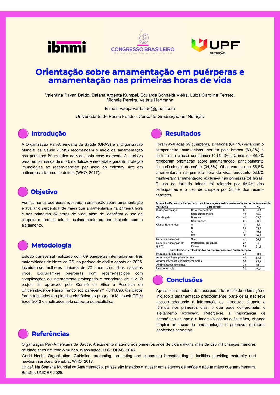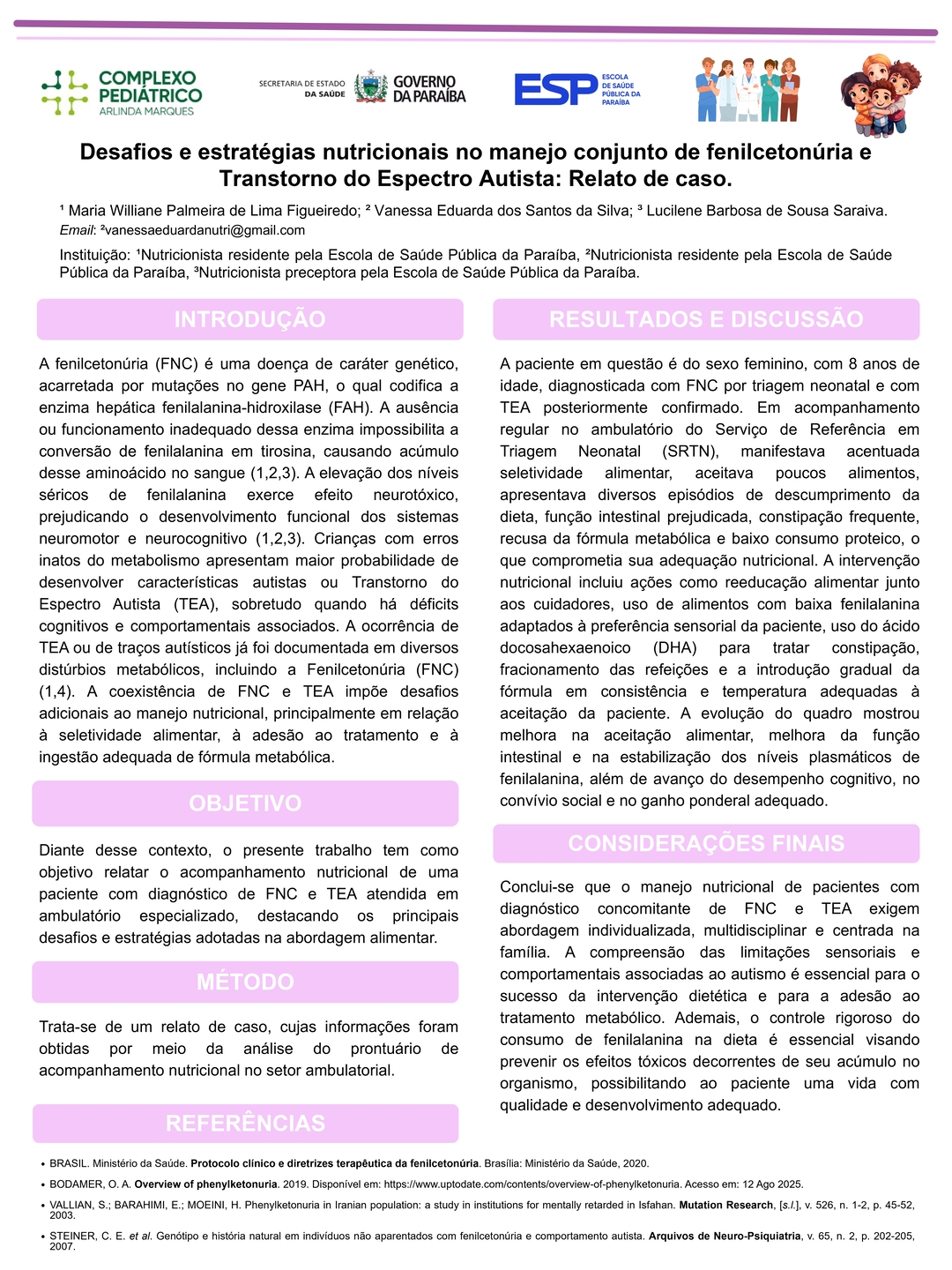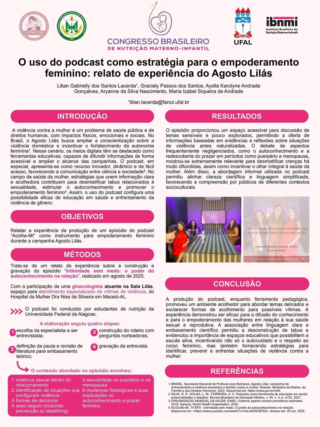 Todos os pôsteres apresentados e aprovados compõem os Anais do 6º Congresso Brasileiro de Nutrição Materno-Infantil, reforçando a relevância da pesquisa e o papel transformador dos profissionais que constroem conhecimento científico na área.